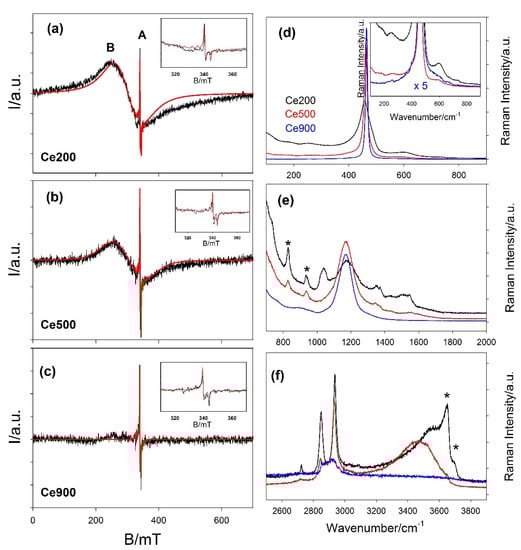 (a–c) Experimental ESR spectra collected at room temperature on the Ce200 (top), Ce500 (middle) and Ce900 (bottom) are reported as black curves. Features A and B are described in the main text. The detail of the A spectrum is reported in the insets. Spectral simulations realized by the model described in the main text are represented by red curves. (d–f) Raman spectra of Ce200 (black), Ce500 (red) and Ce900 (blue) in the (d) 200–900 cm−1, (e) 700–1900 cm−1 and (f) 2500–4000 cm−1 ranges. The insets highlight the less intense features of the same spectra. To this purpose, the blue curve has been multiplied by 5.