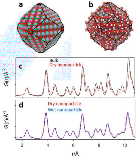 Force field computed dry (a) and wet (b) relaxed nanoparticles. (c,d) computed G(r) curves of bulk (black curve), dry (red curve) and wet (blue curve) nanoparticles.