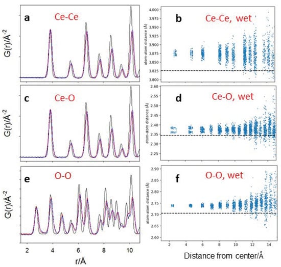 To further analyze the relaxation of the interatomic distance, Figure 10 reports the Ce–Ce, Ce–O and O–O partial PDFs, i.e., the PDF corresponding to single atom pair distances. In the left panels (Figure 10a,c,e), the partial PDFs are displayed, while in the right panels (Figure 10b,d,f), the pair distances are plotted as a function of the distance from the center of the relaxed model of the wet nanoparticle. Partial G(r)s evidence that the oxygen pattern is more disordered than the Ce in the NPs, in accordance with PDF analysis. In addition, the atomic relaxation of the NPs follows a complex pattern: the spread of interatomic distances increases with the distance from the center. The relaxation of the facets begins to be visible above 14–15 Å from the center, pointing to structural disorder located mainly at the surface.