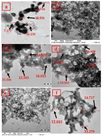 TEM images of 0.05 M and 0.1 M iron oxide (a,b) and 0.05 and 0.1 M iron oxide nanoparticles prepared using 50 mg (c,d) and 100 mg (e,f) of C. officinalis stem bark extract.