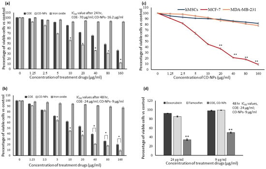 In vitro cytotoxicity assay confirmed that COE and CO-NPs significantly suppressed the MCF-7 cells’ growth within 24 h and increased in 48 h when compared to iron oxide or untreated control (Figure 2a,b). The IC50 doses of COE and CO-NPs were 24 µg/mL and 9 µg/mL after 48 h (Figure 2b). Only the MCF-7 cells’ growth was significantly (p ≤ 0.05) inhibited by CO-NPs treatment (91%); neither hMSCs (18%) nor MDA-MB-231 (22%) cells were significantly (p ≤ 0.05) impaired (Figure 2c). The IC50 doses of COE (24 µg/mL) and CO-NPs (9 µg/mL) were applied to doxorubicin and tamoxifen. The results showed that 24 µg/mL of doxorubicin inhibited only 8%, and tamoxifen inhibited 15% of MCF-7 cells. CO-NPs (9 g/mL) inhibited only 2% after doxorubicin treatment and 1% after tamoxifen treatment for 48 h (Figure 2d).