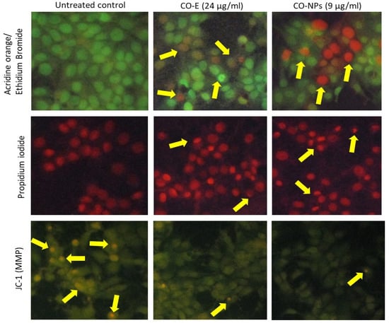 Acridine Orange/Ethidium Bromide (AO/EtBr) dual staining was used to discriminate the hallmark of pre, pro, and late apoptotic morphological alterations as described by []. Briefly, human MCF-7 cells were treated with COE and CO-NPs at 24 µg/mL and 8 µg/mL, and untreated control for 48 h in 24-well plates. After 48 h, treated cells were gently rinsed with PBS, then 500 µL of AO/EtBr (1:1, 4 mg/mL) solution was overlayed until the cells became immersed. After 10-min incubation, the dye was gently washed out using PBS rinsing, and the stained cells were immediately observed under an inverted fluorescent microscope (Carl Zeiss, Jena, Germany) fitted with a green filter, and pictures were taken at 200× magnification.