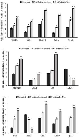 Accordingly, it was clear that CO-NPs loaded with C. officinalis stem bark extract could enhance apoptosis in MCF-7 mitochondria, leading to intrinsic pathway activation. This was confirmed by examining the expression of specific tumor suppressors (Cdkn2a, pRb1, p53, and mdm2), oxidoreductase mediators (CYP1A, GSK-3β, and GPx), inflammatory markers (TNF-αand Nf-κb), and apoptotic genes (BAX, Bcl-2, Caspase-3, Caspase-9, and p21). Therefore, during a 48-h incubation period, we measured the toxicity of COE and CO-NPs on MCF-7 cells using the quantitative PCR technique. We discovered that CO-PNs significantly elevated the expression of the oxidative stress genes cytochrome P4501A (CYP1A), glycogen synthesis kinase-3beta (GSK-3 β), and glutathione peroxidase (GPx), as well as the cytokines tumor necrosis factor-alpha (TNF-α) and nuclear factor-kappa B (Nf-κb) in comparison to COE and untreated cells. This indicates the occurrence of oxidative stress and, consequently, DNA damage because of increased reactive oxygen species (ROS) that initiate the gene expressions related to the mitochondrial and extra-mitochondrial apoptotic pathways [,]. The overexpression of CYP1A can release ROS that leads to the augmentation of ROS over antioxidants, eventually causing inflammation and toxicity [].