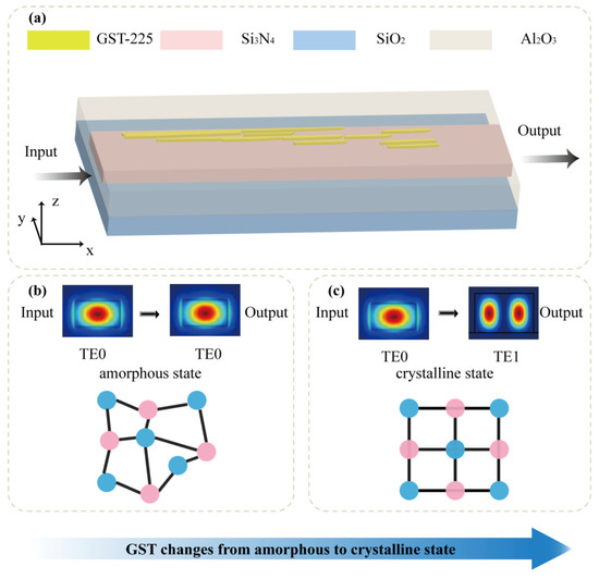 Figure 1a shows a 3D schematic of the programmable mode converter, which consists of a freeform GST-225 metasurface directly integrated on a silicon nitride (Si3N4) waveguide. A subwavelength structure and GST-225 material are used to change the propagation constants in waveguides. When GST-225 is in the amorphous state, the permittivity is 4.725 + 0.07i, and when GST-225 is in the crystalline phase, the permittivity is 7.49 + 1.356i [26]. Since the imaginary part of the refractive index of GST-225 cannot be ignored, we set its thickness to 30 nm to reduce the transmission loss. Comparing the extinction coefficients, when GST-225 is in the crystalline state, its value is nearly 20 times that of the amorphous state. In terms of device loss, the efficiency of amorphous devices is higher than that of crystalline devices, and the difference in efficiency is related to the structure distribution. The efficiency effect caused by the difference in extinction coefficient will be given later. To ensure high-transmission efficiency of TE0 and TE1 modes in the waveguide, the thickness and width of the waveguide are 0.33 μm and 1.8 μm, respectively. A layer of Al2O3 material with a dielectric constant between the two materials is added between the waveguide layer and the air, which not only improves the mode transmission efficiency of the waveguide but also improves the integration. Referring to the previous literature [26], we set its thickness to 218 nm and the permittivities of Si3N4 and Al2O3 are 1.7 and 1.74. Figure 1b,c illustrate that when the GST-225 is in the crystalline state, the waveguide realizes single-mode transmission of the TE0 mode. Because the GST-225 material can compensate for the propagation constant difference between TE0 and TE1 modes, the device realizes the conversion of the TE0 mode to the TE1 mode when the GST-225 changes from the crystalline state to the amorphous state.