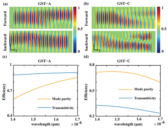 (a) When GST-225 is in the amorphous state, TE0 mode can be output in TE0 mode at the forward or backward transmission. (b) When the GST-225 is in the crystalline state, the TE0 mode and the TE1 mode are transmitted in the forward and backward transmission, and another mode is obtained at the output. (c,d) When GST-225 is in the amorphous and crystalline state, the transmission efficiency and mode purity distribution differ at different wavelengths.