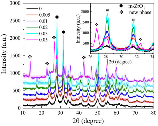 In a typical synthsis of the ZrO particles, ZrOCl·8HO (SCRC, analytical reagent, AR) and NaBF (SCRC, AR) were used without further purification. A homogeneous solution with ZrOCl·8HO concentration of 0.1 mol/L and NaBF concentration of 0∼0.05 mol/L was formed by the appropriate amount of material dissolved in 30 mL deionized water. Then the mixed solution was transferred into a 50 mL Teflon-lined hydrothermal reactor and heated at for 12 h. Upon cooling the resulting precipitate was filtered and washed with distilled water for several times. And finally, the precipitate was dried at for 24 h. In order to describe simply, the samples synthesized with different concentration of NaBF as mineralizer are denoted as HT-ZrO(x), where x represents the molar concentration of NaBF.