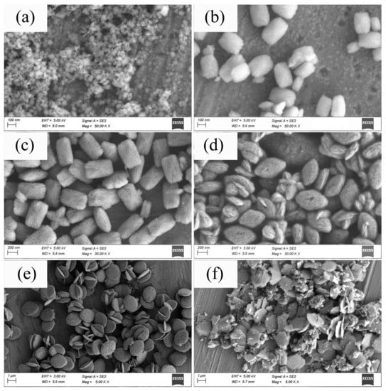 SEM micrographs of HT-ZrOx particles synthesized with different concentration of NaBF. (a) x = 0, (b) x = 0.005, (c) x = 0.01, (d) x = 0.02, (e) x = 0.03, (f) x = 0.05.