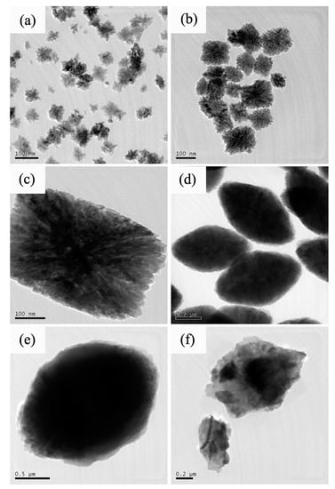 TEM micrographs of HT-ZrO(x) particles synthesized with different concentration of NaBF. (a) x = 0, (b) x = 0.005, (c) x = 0.01, (d) x = 0.02, (e) x = 0.03, (f) x = 0.05.