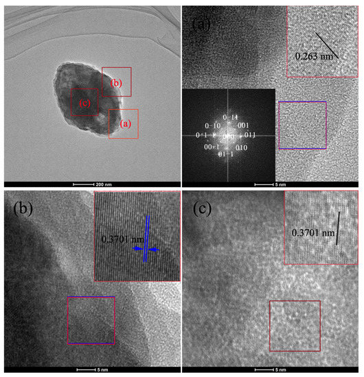 With the increasing concentration, due to the formation mechanism of diamond-, and plate-like ZrO particles are similar, the HRTEM images on the same zone axis at different positions of the diamond-like particles are shown in Figure 6. It is interesting to note that, the particles are not stacked with nanobar but nanosheet. It is a pity that the shape of the nanosheet can not be clearly observed because of its big particle size and thickness. The interplanar spacings of 0.263 nm and 0.3701 nm determined from Figure 6a–c correspond to the (002) and (011) crystal planes, proving (100) to be the exposed surface. The (100) planes possess a strong capacity for crystal inter-overlapping. We predict the formation of diamond- and plate-like particles as follow: Firstly, nanosheets use their (001) and (010) planes to form a coplanar sheet-like structure, due to the attach rate of (001) plane is faster than the one of the (010) plane. So the length of the particle along [001] direction is longer than the width along [010] direction. Then the coplanar sheet-like structure is coupled with another crystal underneath and upward the oriented attachment of their (100) planes, and finally forms a stratified structure.
