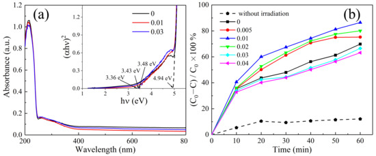 Figure 7a displays the UV-vis diffuser reflectance of the HT-ZrO(x) (x = 0, 0.01 and 0.03). The optical absorbtion spectras of the ZrO synthesized with and without mineralizer all show a strong absorbtion with the wavelength shorter than 254 nm and a light absorbtion with the wavelength between 250 to 400 nm. It means that the increasing particle size and morphology could not change the optical absorbtion property. The Wood and Tauc’s polt for determining band gap energy is shown in the insert picture. The direct band gap for all the samples are all the same with 4.94 eV, and the band gap introduced by defect increases with the addition of NaBF mineralizer. Figure 7b shows the decolorization efficiency of MB under simulated solar irradiation with in 60 min for various ZrO particles. The decolorization efficiency of MB increases with octahedron-like particles, but when the particle shape changes into diamond- or plate-like morphologies, the decolorization efficiency decreases. Especially for the plate-like particle, the decolorization efficiency is lower than the ZrO samples synthesized without mineralizer, it may be due to the enlarged particle size with micrometer. For the octahedron-like particles synthesized with the concentration of NaBF 0.01 mol/L, the maximum decolorization efficiency of MB reach 88%.