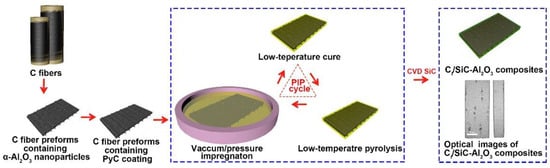 The mechanical properties of Cf/SiC composites are determined by their microstructures. Density is the one of the most important factors [18] and in general, high density corresponds to high mechanical properties. Alpha-alumina (α-Al2O3) is a popular sintering additive for fabricating liquid phase sintered SiC ceramics [19,20]. The use of α-Al2O3 is supposed to promote the densification of SiC and thus result in higher fracture toughness compared with solid phase sintered SiC. However, there is a lack of research on the addition of α-Al2O3 as a sintering aid in the matrix of Cf/SiC composites. In addition, the density of Cf/SiC composites is also governed by the fabrication process [18]. The PIP process, which is most widely used to prepare Cf/SiC, offers many potential advantages, such as a low processing temperature, controllable ceramic compositions and near-net shape ability. Despite these advantages, the basic limitation of the PIP process is the high volume shrinkage (about 50–60%) and pronounced porosity accompanied by the mass loss of the small molecules of the polymer during pyrolysis [8]. As a result, many infiltration–cure–pyrolysis cycles are required to densify the composites. To solve the problem, α-Al2O3 can be used as a filler to be added to the carbon fiber bundles before the fiber preform weaving step to improve the manufacturing efficiency of the matrix. In addition, α-Al2O3 can effectively reduce the diffusion rate of oxygen, which is also a favorable factor for serving in a high-temperature air environment [21]. Furthermore, α-Al2O3 can be used as a stress sensor using the detecting photoluminescence piezospectroscopy (PLPS) [22] of the persistent impurity of Cr3+ in α-Al2O3 to investigate thermal residual stress in the matrix of Cf/SiC composites.