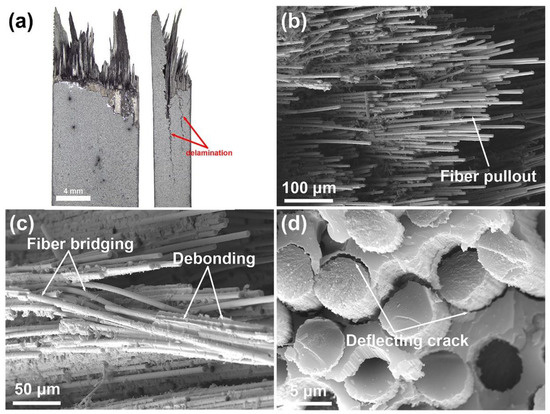 Figure 9a shows typical optical microscope images of the fracture morphology for the Cf/SiC-Al2O3 composite after the bending test. The fracture surfaces of the Cf/SiC-Al2O3 composite are ‘brushy’ and show extensive long fiber pullout, with the fiber pullout length reaching ~6 mm. The composite after the bending test exhibits delamination behavior, which is mainly due to the poor interlaminar shear strength of the unidirectional, laminated structure. Delamination behavior as a way to dissipate fracture energy can improve failure tolerance and fracture toughness of the composites [24]. The delamination behavior of composites contributes to the step-down characteristic of the nonbrittle stage in Figure 8. Figure 9b–d show the SEM images of the fracture morphology of the Cf/SiC-Al2O3 composite after the bending test. A considerable number of fiber monofilament pullouts and fiber bundle pullouts are clearly discernible. Irregularly shaped matrix chips are retained on the pulled-out fibers, which play a role in transmitting load. Moreover, fiber bridging and deflection crack failure modes are also observed in Figure 9c,d. These failure modes for the composites provide energy dissipation which leads to an increase in fracture toughness and strength [47,48,49,50].