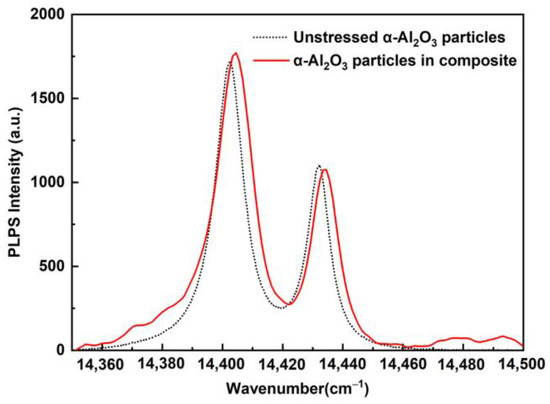 where and are the piezospectroscopy coefficients of the crystallographic a and c axis of the Cr3+-doped Al2O3; and the sum of the piezospectroscopy coefficients (2 + ) are 7.59 and 7.61 cm−1 GPa−1 for the R1 and R2 lines, respectively, as determined by He and Clarke [57]. ΔP is the R peak shift relative to the unstressed position P0, which is determined from the unstressed α-Al2O3 particles, as shown in Figure 11. The R2 peak shift is used for stress measurement as its peak shift maintains a linear relationship with the residual stress [58]. From Equation (7), the relationship between the residual stress (σ) in the α-Al2O3 nanoparticles for the composite and the R2 peak shift (ΔP2) can be expressed as follows: