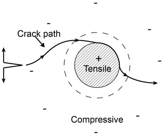 On the one hand, the SiC-Al2O3 matrix can be regarded as an α-Al2O3 particulate-reinforced SiC ceramic matrix composite, regardless of the carbon fibers temporarily. For the particulate-reinforced ceramic composite, toughening by thermal compressive residual stresses is one of the effective toughening mechanisms when the coefficient of the thermal expansion of the dispersed particles is larger than that of the matrix grains [63]. According to Wei [64] and Taya et al. [65], the thermal residual stress field in a particulate-reinforced ceramic composite consists of two regions: the tensile stress region in the particulates and the compressive stress region in the neighboring matrix, as shown schematically in Figure 12. Consider a semi-infinite crack surrounded by a particulate-reinforced ceramic matrix composite with a thermal residual stress distribution. The thermal residual compressive stress in the neighboring matrix can deflect the crack in the matrix to increase toughness, which is typically observed in most particulate-reinforced ceramic matrix composites [63]. In addition, the compressive residual stress in the neighboring matrix could result in the closing of the preparation processing-induced matrix microcracks. Consequently, the strength and toughness of the SiC ceramic matrix for the particulate-reinforced SiC ceramic matrix are improved by the thermal residual stress distribution around the particulates, which further contributes to the whole properties of the Cf/SiC composite.