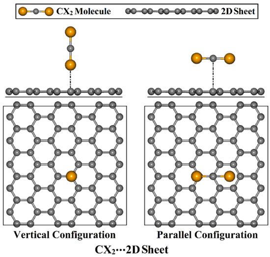 where , , and are the charge densities of complexes, adsorbed CX2 molecules, and 2D sheets, respectively. The Visualization for Electronic and Structural Analysis (VESTA) package was used to generate the ∆ρ maps [54]. Analysis of the Bader charge [55] was utilized to determine the charge transfer (Qt) to or from the 2D sheets according to Equation (3):