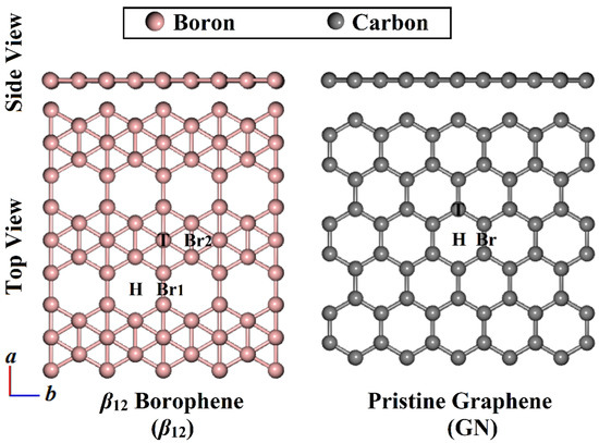 After the relaxation of the β12 and GN sheets, the optimized lattice parameters of their primitive cells were a = 5.06 Å and b = 2.93 Å for β12 sheets (Figure 2), while a and b had a similar value of 2.47 Å in the case of GN sheets. The obtained findings were compatible with experimental and theoretical evidence [33,37,56,57].