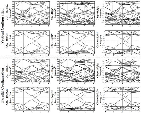 Figure 4 shows that the electronic properties of 2D sheets were marginally affected by the adsorption of the CO2 molecule in both studied configurations on the surfaces of the β12 and GN sheets (see Figure S2). Such an observation outlines that β12 and GN cannot be highly effective CO2 sensors, which agrees with evidence from previous studies [44,58]. In contrast, the adsorption of the CS2 and CSe2 molecules in vertical and parallel configurations on the β12 and GN sheets resulted in the appearance of many new bands in valence and conduction regions, as illustrated in Figure 4. The band structure plots showed that the bands of β12 moved far away from each other after adsorbing CS2 and CSe2 molecules, confirming the strong adsorption of these molecules on the β12 sheet. In detail, the resultant band structures after the adsorption of CS2 molecules on β12 showed extra conduction bands in the vertical and parallel configurations at around 2.3 and 1.8 eV, respectively. Besides this, new valence bands were noticed at –1.8 and –2.0 in the vertical and parallel configurations, respectively. For CS2⋯GN complexes, additional conduction and valence bands in both configurations were found at 1.5 and –2.5 eV, respectively. The band structures of the CSe2⋯β12 complexes strongly affirmed the more evident impact of the adsorbed CSe2 molecules on the electronic characteristics of the β12 sheet in the parallel configuration compared with the vertical analog. For adsorption of the CSe2 molecule in the parallel configuration at the H@β12 site, new bands were observed at 1.35, 1.55, and 1.65 eV in the conduction region. In addition, new bands at −0.4, −0.65, and −1.75 eV appeared in the valence region, as depicted in Figure 4.