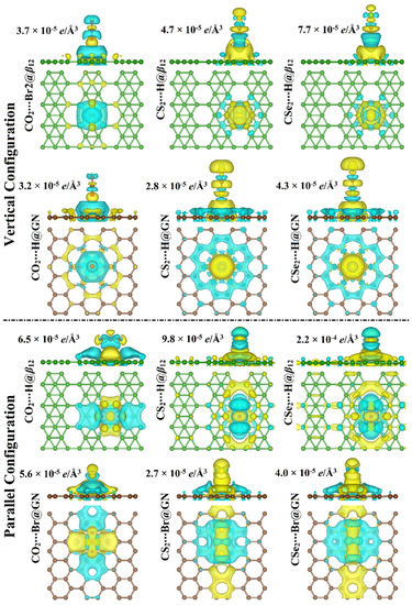 where , , and represent the energies of complexes, adsorbed CX2 molecules, and 2D sheets, respectively. The charge density difference (∆ρ) calculations were estimated using Equation (2):