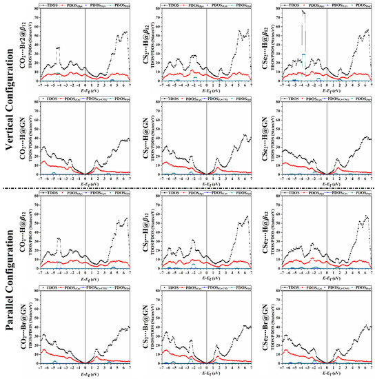 Total and projected densities of states (TDOS/PDOS) for the relaxed structures of the vertical and parallel configurations of the CX2⋯β12/GN complexes (where X = O, S, or Se) at the most favorable energetic sites. The contributions of the p-orbital for boron (B), carbon (C), oxygen (O), sulfur (S), and selenium (Se) atoms in the adsorption process are represented by Bp, Cp, Op, Sp, and Sep, respectively.