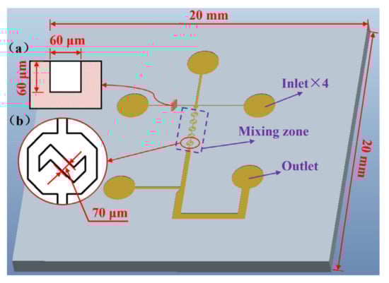 To achieve fast and effective mixing of heavy metal-containing liquids, the structure of a micro-fluidic chip was designed (as shown in Figure 1), including four inlets, one outlet and a mixing zone. The mixing zone is a region containing micro-channels and five liquid micro-mixing areas. The other connecting structures are micro-channels with a depth of 60 μm, a minimum width of 60 μm and a maximum width of 300 μm. The molding quality of the micro-channels and micro-mixing structures of the micro-fluidic chip is the key to achieving heavy metal detection and performance analysis.