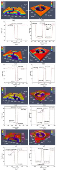 The morphology and dimensions of the PC, PMMA, COC and PS micro-structures are shown in Figure 5. Apparently, the micro-channels and micro-mixing structures of microfluidic chips could be well replicated from the Ni mold insert by injection molding. However, the edges of micro-structures of different materials were all elongated after demolding. Compared with other polymers, the PC micro-structures had the most severe elongation deformation, as shown in Figure 5a–d. Due to the low elongation of the materials, the edges of the COC and PS micro-structures were damaged during the demolding process. The tensile deformations and fracture of the edges were mainly attributed to adhesion and friction, which induced demolding resistance []. As a result, ridges appeared at the top of the PMMA micro-mixing structure, as shown in Figure 5f,h. It is worth mentioning that the wall perpendicularity of the micro-structures were all well replicated, as seen in the profiles of the molded chips. The surface morphology of the PC and PMMA microfluidic chips presented a wavy shape, while the COC chips had the best flatness. The craggy walls at the bottom of the PC and PS micro-mixing structures would affect the flow of the liquid. There was a slight necking and depressed deformation at the bottom of the micro-structures after demolding [], which could be relatively neglected. Compared to surface flatness and necking, deformation by stretching and fracture were the molding defects that most affect chip performance.