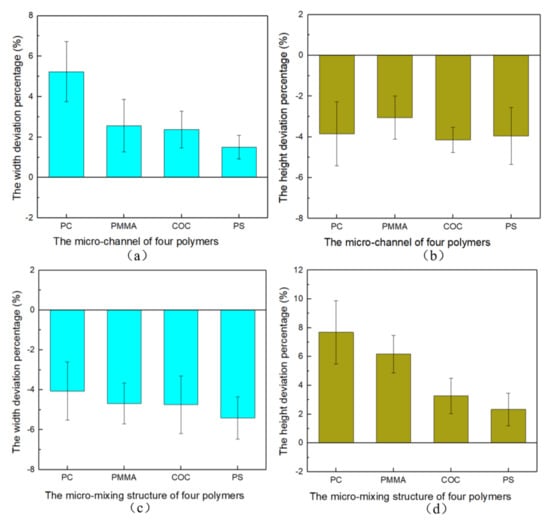 The deviation percentage of PC, PMMA, COC and PS microfluidic chips: (a,b) micro-channel, (c,d) micro-mixing structure.