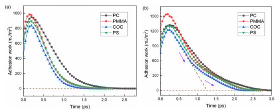 The calculated adhesion work between the polymer and the mold insert during the demolding process is shown in Figure 9. The variation trends were basically the same for different polymers and structures. In the initial stage, the adhesion work increased continuously and reached a peak value at about 0.25 ps. At this point, the external force was smaller than the adhesion and friction forces, but larger than the intermolecular forces [,]. The polymer structure was stretched and loosened at this stage, although there was no separation between the polymer molecular chains and the mold insert. After 0.25 ps, the distance between the molecular chains and the mold insert gradually increased. The demolding process was completed when the adhesion force dropped to zero, which meant that there was no longer any interfacial interaction between the polymer and the mold insert. Therefore, the demolding process was not a direct separation process, but a gradual separation by overcoming interfacial and intermolecular interactions under the action of external forces. Compared with the channel structure, the total adhesion work of the mixing structure was increased by about 41% to 55%. This brought an increase in the deviation percentage of the micro-mixing structure width after demolding. In addition, the decreasing rate of the adhesion work of the mixing structure tended to decrease in the late stage of demolding. The corresponding decreasing rates of the adhesion work curves for PC, PMMA, COC and PS slowed down around 1.7 ps, 1.0 ps, 0.8 ps and 1.0 ps, respectively, as shown in Figure 9b. At the same time, the action time of the adhesion work increased to some extent.