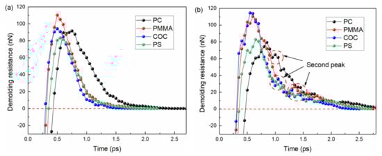The demolding resistance, consisting of adhesion and friction forces, is the main factor in the deformation of polymer structures []. To explore the internal mechanism of molecular chain movement, the demolding resistance was further analyzed. The variations were similar to the adhesion work of the four polymers on different mold insert structures, as shown in Figure 10. Under the combined effect of adhesion and sliding friction, the demolding resistance first gradually increased to a peak value and then decreased to zero as the demolding process proceeded. After the adhesion force reached its peak, the molecular chains started to separate from the mold insert in the horizontal direction, and the sliding friction force started to contribute to the total demolding resistance. In comparison with Figure 9, it could be seen that the effect of friction was significantly greater for COC than for the other three polymers, which lead to a greater demolding resistance than for PC and PS. However, COC had relatively compact molecular chains without severe tensile deformation, as its resistance to demolding was the shortest. The longest action time of the interfacial interaction between the PC and the mold insert produced severe structural incompatibility defects and voids, although the adhesion work was not the greatest. This resulted in the maximum tensile deformation of the PC micro-mixing structure in the experiment, as shown in Figure 6d. The second peak of the demolding resistance of the mixing structure occurred between 1.0 ps and 1.5 ps, which did not occur during the demolding of the channel structure, as shown in Figure 10b. Due to the large contact area, the friction force between the molecular chains and the sidewall of the mold insert was significantly higher during the sliding process.