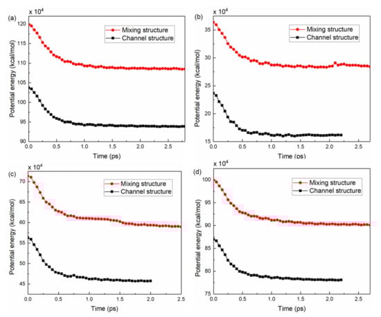 The potential energies of the four polymers during the demolding stage were calculated, as shown in Figure 11. During the filling stage, the pressure was converted into potential energy and stored in the polymer system. Under the action of external forces, the potential energy was released and decreased rapidly until 0.5 ps. Accordingly, the polymer structure changed from a compact state to a loose state. The potential energy trends of the four polymers on the mold inserts with different structures were essentially similar. It could be noted that the potential energy of the mixing structure before and after demolding were significantly larger than that of the channel structure. The potential energies of PC and PS were higher compared to the other two polymers. This may be due to the relatively high structural stiffness, because of the presence of polar groups such as benzene rings in the molecular chains []. The main cause of polymer deformation could not be attributed exclusively to the work of adhesion; the release of potential energy was also an important aspect.