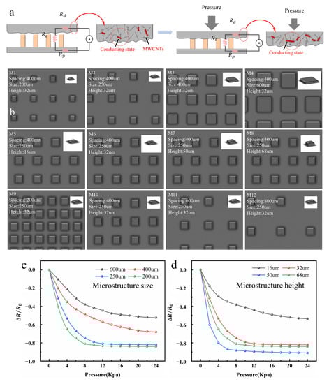 As shown in Figure 4a, there were three main resistances of the sensor, which were the silver IDE resistance Rp, the microstructure resistance Rc, and the PDMS/MWCNTs thin-film resistance Rd. When the pressure P = 0, there were fewer passages between the MWCNTs mixed in the PDMS, resulting in a large resistance value of Rd; when the pressure P ≠ 0, the PDMS was squeezed, causing more mutual contact between the MWCNTs inside it. MWCNTs formed more conductive paths inside the PDMS, which reduced Rd. Secondly, when the pressure P was applied, the total resistance was as shown in the Figure 4a. During the loading process, the number and contact area of the contact with the conical microstructures increased, attributed to the deformation of the PDMS/MWCNTs film layer under the force, and the value of Rc decreased. In the process of unloading, the deformation of the PDMS/MWCNTs film gradually decreased. On the one hand, it caused the reduction in the MWCNTs conduction path and led to the increase in Rd; on the other hand, it led to the decrease in the contact area and the number of contacts between the film and the cone. The decrease caused an increase in the resistance value Rc. Therefore, it could be seen that ∆R in the above formula was mainly the change in Rc and Rd.