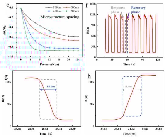 where S is the sensitivity, ∆R is the change value of the resistance, ∆P is the pressure per unit area of the sensor, and the pressure is applied by the Keithley6510 and electronic universal material testing machine, shown in Figure 3h; R is the resistance value of the sensor when it is pressurized, and R0 is the initial resistance value of the sensor in the unpressurized state.