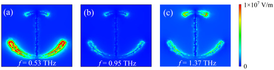 To illustrate the resonant coupling characteristics of the AIGS sensor with the lactose molecule, Figure 3 depicts the electric field distribution of the sensing structure. When E F = 0.66 eV, there are two significant transmission valleys in the transmission spectrum near 0.53 THz and 1.37 THz. It can be seen from Figure 3a that at the resonant frequency f = 0.53 THz, and the enhanced electric field is concentrated at the edge of the lower arc. This is because the incidence THz waves can excite graphene electrons to oscillate within a finite radian and thus excite local surface plasmon resonance (LSPR) in a larger graphene arc. As shown in Figure 3c, at resonant frequency f = 1.37 THz, the locally enhanced electric field is mainly restrained at the edge of the upper arc. This is due to the strong L C resonance caused by the coupling of the incidence THz waves with the upper and lower arcs of the graphene, thus enhancing the local electromagnetic field. This resonance is efficient at capturing the energy of the THz waves and has enough time to eliminate the effects of ohmic losses within graphene [40]. Therefore, the electric field enhancement of the upper and lower arcs is helpful to increase the absorption cross-section of the lactose molecule, thus enhancing the vibration signal of the lactose molecule, which is conducive to the detection of a low concentration of lactose forming thinly onto the electrodes. As shown in Figure 3b, there is basically no electric field enhancement in the graphene arc I-shape at the non-resonant frequency ( f = 0.95 THz) because the non-resonant frequency is far away from the two plasmonic resonance frequencies of the structure.
