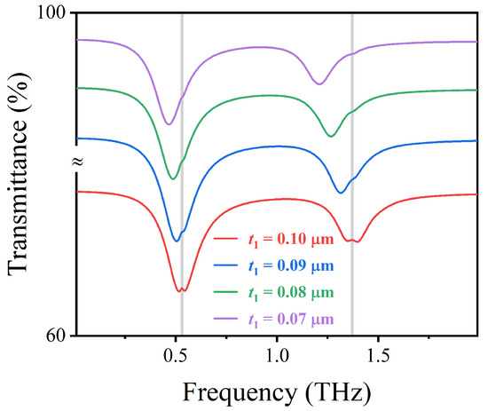 Figure 4. The transmission spectrum of AIGS at different lactose thicknesses t 1 under vertically incident TM waves.
