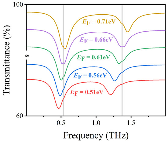 Note that this characteristic makes up for the shortcoming that metal devices are not dynamically adjustable. Moreover, by controlling the gate voltage V g , it is sensitive to detect the vibrational fingerprints of lactose molecules. As shown in Figure 5, we investigate the transmission spectrum variation of the sensor structure at different Fermi energy E F . The grey vertical stripes at 0.53 THz and 1.37 THz represent two vibrational fingerprint spectra of lactose molecules. As E F decreases from 0.76 to 0.56 eV, the left resonant frequency red shifts from 0.56 to 0.46 THz, and the right resonant frequency redshifts from 1.46 to 1.21 THz. This is because the wave vector of the excited surface plasmon on graphene satisfies k s p p 2 f 2 2 f 2 2 e 2 2 e 2 E F , where f is the resonant frequency [42]. It follows that the resonant frequency is approximately proportional to E F , which explains that the reduction of Fermi energy E F can make the transmission spectrum red shift. The simulation results in Figure 5 also show that the position of the transmission spectrum can be dynamically tuned by changing the Fermi energy of graphene to conform to the vibrational fingerprints of lactose molecules without changing the structural parameters of the designed sensor. When E F = 0.51 eV, the two vibrational fingerprints of lactose are almost undetectable, because the formants are far from them. However, when E F = 0.66 eV, the left resonance and right resonance of the structure coincide with the vibration of lactose 0.53 THz and 1.37 THz, respectively, and the vibration signal of lactose is enhanced.