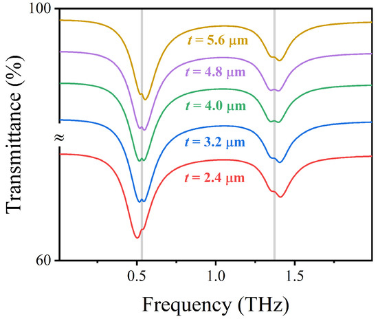 Figure 6. Transmission spectra of AIGS covered with lactose at different substrate thicknesses t under vertically incident TM waves.