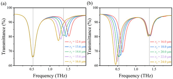 Figure 7. (a,b) Transmission spectra of AIGS covered with lactose at different arc radii r 1 and r 2 under vertically incident TM waves.
