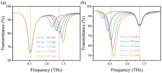 Figure 8. (a,b) Transmission spectra of AIGS covered with lactose at different arc widths w 1 and w 2 under vertically incident TM waves.