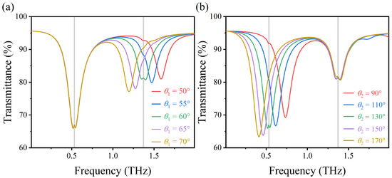 Figure 9. (a,b) Transmission spectra of AIGS covered with lactose at different radians θ 1 and θ 2 under vertically incident TM waves.