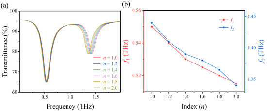 To further study the refractive index sensing characteristics of the proposed structure, the transmission spectrum of AIGS in different refractive index layers are calculated. Since the refractive index of biomolecules is mostly in the range of 1.0–2.0, the refractive index of the material layer above AIGS is successively increased from 1.0 to 2.0 (step size is set as 0.2) in our calculation, and the thickness of the layer is fixed at 0.1 μ m. The corresponding sensing structural parameters are set as p = 50 μ m, r 1 = 14.6 μ m, w 1 = 1.5 μ m, r 2 = 20 μ m, w 2 = 1.5 μ m, w 3 = 1.5 μ m, θ 1 = 60 , θ 2 = 130 , and E F = 0.66 eV. As shown in Figure 10a, with the increase of n from 1.0 to 2.0, both the left resonance frequency f 1 and the right resonance frequency f 2 have a red shift. The frequency shift of f 1 is 0.035 THz, and the frequency shift of f 2 is 0.1 THz. As shown in Figure 10b, with the change of refractive index n of the material layer, both left resonance frequency f 1 (red curve) and right resonance frequency f 2 (blue curve) show good linearity, which is beneficial to the practical application of refractive index sensing. To quantify the performance of the proposed sensor, we calculate the left and right resonance sensitivities S = Δ f Δ f Δ n Δ n . The sensitivities of the left and the right transmission peaks are calculated to be 0.035 THz/RIU and 0.10 THz/RIU, respectively. The sensitivity of both the left and right resonance is lower than that of the sensor based on four metal crosses (0.45 THz/RIU) [44]. The sensitivity of the right resonance is higher than that of the sensor based on InSb-based metallic gratings for lactose molecular detection (0.06 THz/RIU) [45].