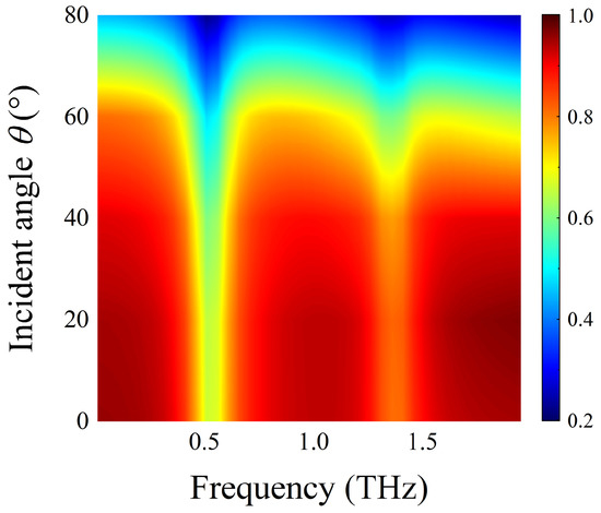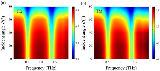 Figure 14a,b, respectively, describe the transmission spectra of DAIGS covered with lactose at different incidence angles under TE and TM polarization, where the x-axis represents frequency and the y-axis represents incidence angle θ . The Fermi energy of graphene is fixed at E F = 0.70 eV. It is noteworthy that when the incident angle θ varies from 0° to 70° for both TE and TM polarization, there are two significant plasmon resonance dips at 0.52 THz and 1.36 THz, which can coincide with the two vibration fingerprints of the lactose molecule in the spectrum. At the same time, it also shows that DAIGS is insensitive to incidence angles, which makes the structure have excellent molecular detection performance in a wide range of incidence angles.