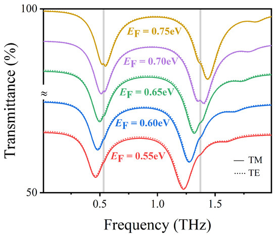 Figure 13. Transmission spectra of lactose covered DAIGS at different Fermi energies under TE or TM incidence waves.