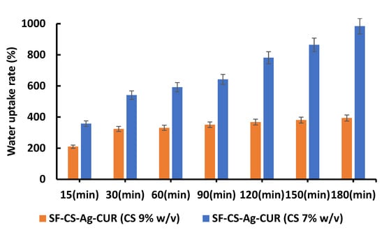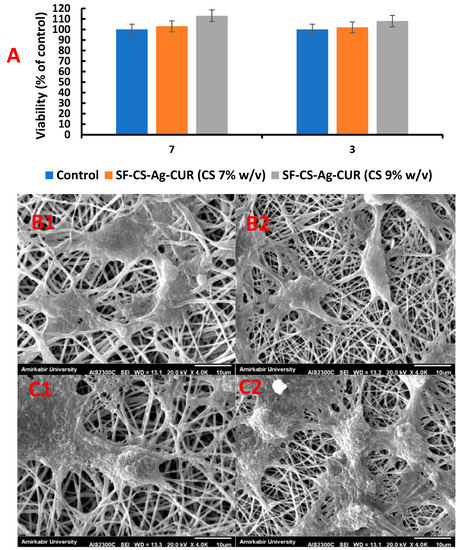 | Un-crosslinked | SF-CS-Ag-CUR (CS 7% w/v) | 3.14 ± 4.6 | 0.69 ± 2.3 | 1.44 ± 3.7 | 87 ± 3.2 | |