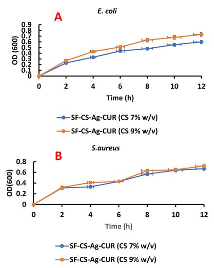 Chicago/Turabian StyleHeydari Foroushani, Parisa, Erfan Rahmani, Iran Alemzadeh, Manouchehr Vossoughi, Mehrab Pourmadadi, Abbas Rahdar, and Ana M. Díez-Pascual. 2022. "Curcumin Sustained Release with a Hybrid Chitosan-Silk Fibroin Nanofiber Containing Silver Nanoparticles as a Novel Highly Efficient Antibacterial Wound Dressing" Nanomaterials 12, no. 19: 3426. https://doi.org/10.3390/nano12193426