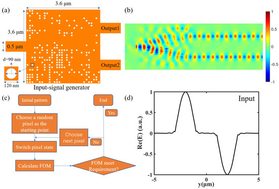 By iterating the pixels, we obtain the optimized structure shown in Figure 3a. This device is designed on SOI substrates with a Si thickness of 220 nm and a thickness of 1 . The input light of this device is TE polarized light at 1550 nm wavelength. It has an ultra-compact footprint of 3.6 × 3.6 and is divided into smaller square pixels with the size of 120 nm × 120 nm. Each pixel has two states, with or without a circular air hole in the center, shown as the white circular in Figure 3a. The diameters and depths of the circular air holes are 90 nm and 220 nm. The insert loss of this device is −1.43 dB. The transmissions of output1 and output2 are 0.361 and 0.358, respectively, which is approximately equal. The phase difference between two waveguides is 3.161 rad, which is basically the same as . Figure 3b shows the electric field distribution of this device. We can clearly see that the wave is divided into two parts, and the phases are gradually staggered in the main part of device. Finally, the energies in the two waveguides are basically the same, and have a phase difference of . The main purpose of this device is to replace the bulky signal generator used in the experimental verification of on-chip 4f system optical computing device in the past. Finally, this device can generate the input signal as shown in Figure 3d. We use the signal generated by this signal generator to simulate and obtain the corresponding results in the following adder and ODE solver. Similarly, by using the DBS algorithm, similar structures, and more ports and then calculating different FOM functions, we can design more signal generators that can generate various input signals.