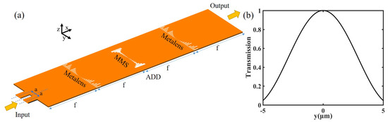 Next, we set a = 2 , = 1550 nm, f = 15 . The transmission function that the MMS needs to satisfy is shown in Figure 4b. We need to elaborately design the width and length of the slits in different period positions according to the transmission modulation library of Figure 2c, so that the MMS composed of different air slits can satisfy the above transmission function. Here, we use 20 air slits to implement the function curves. The corresponding lengths and widths of each air slit are shown in Table 1. Finally, our designed adder structure is shown in Figure 4a. The MMS structure shows a symmetrical distribution with a thin middle and thick sides, which can make the light passing through it have a higher transmission in the middle and a lower transmission on both sides, so as to conform to the transmission distribution in Figure 4b.