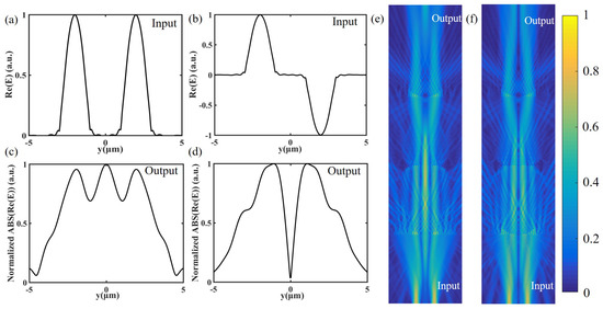 We simulate the device with two different input signals as shown in Figure 5a,b. When two waveguides input two beams of light with no phase difference (Figure 5a), a peak can be seen in the middle of the output result (Figure 5c). There will be side lobes on both sides of the output center, and the peak intensity is basically half of the sum of the highest points of the side lobes, which is consistent with the theory. The effect of adding the two beams is shown in the electric field distribution (Figure 5e). There is a distinct peak in the center of the output. We can obtain the result of adding the two signals by placing a waveguide in the center of the output plane. When two beams of light have phase difference (Figure 5b), the theoretical added output is 0. At this time, we can also see that it is basically 0 in the middle of the simulated output result (Figure 5d), and, in the corresponding electric field diagram (Figure 5f), the electric field in the middle of the output plane is nearly 0. The results perfectly fit the function of an adder.