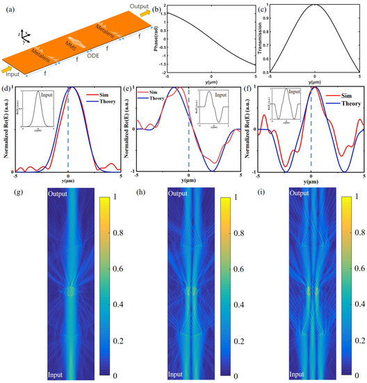 (a) Schematic diagram of the structure of the ode solver. (b) MMS phase-shift distribution. (c) MMS transmission distribution. (d–f) Normalized theory and simulation output of different input. The blue dotted line is the center of the picture, which can show the slight shift effect of the output result through comparison. Figure (g–i) are the schematic diagrams of the electric field corresponding to the Figure (d–f), respectively.