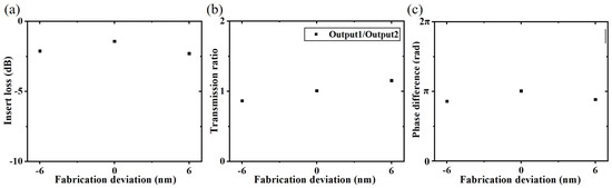 When the hole-diameter fabrication deviation is 0 nm, −6 nm, or 6 nm, (a) the insertion loss of the device, (b) the transmission ratio of Output 1 and Output 2, and (c) the phase difference of two channels.