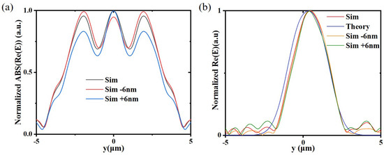 For the adder and OED solver, we select an input signal, respectively, to analyze the impact of fabrication deviation on performance. As previously stated, we assume that the lengths and widths of all slits are widened or shortened by 6nm. After simulation, we obtain the normalized results as shown in Figure 8. For the adder, we select the input signal of Figure 5a. As shown in Figure 8a, when the fabrication deviations are −6 nm and +6 nm, compared to the side lobe, the middle peak slightly decreases and rises, respectively, but the effect of adding is obvious. After that, the side lobes will be filtered out, and we will finally obtain the output result through a waveguide located in the middle of the output plane, so the fabrication deviation within at least 6 nm has little impact on the device. For the ODE solver, we select the input signal of the insert of Figure 6d. As shown in Figure 8b, the output results are only slightly different when the fabrication deviations are −6 nm and +6 nm, which indicates that this device has good robustness within the range of 6 nm fabrication deviation.