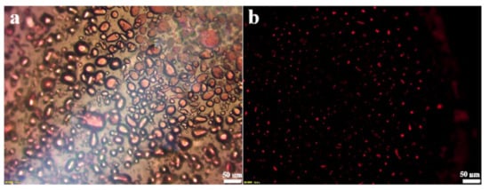 Fluorescence microscopy of the O/W emulsion in bright field (a) and dark field (b).